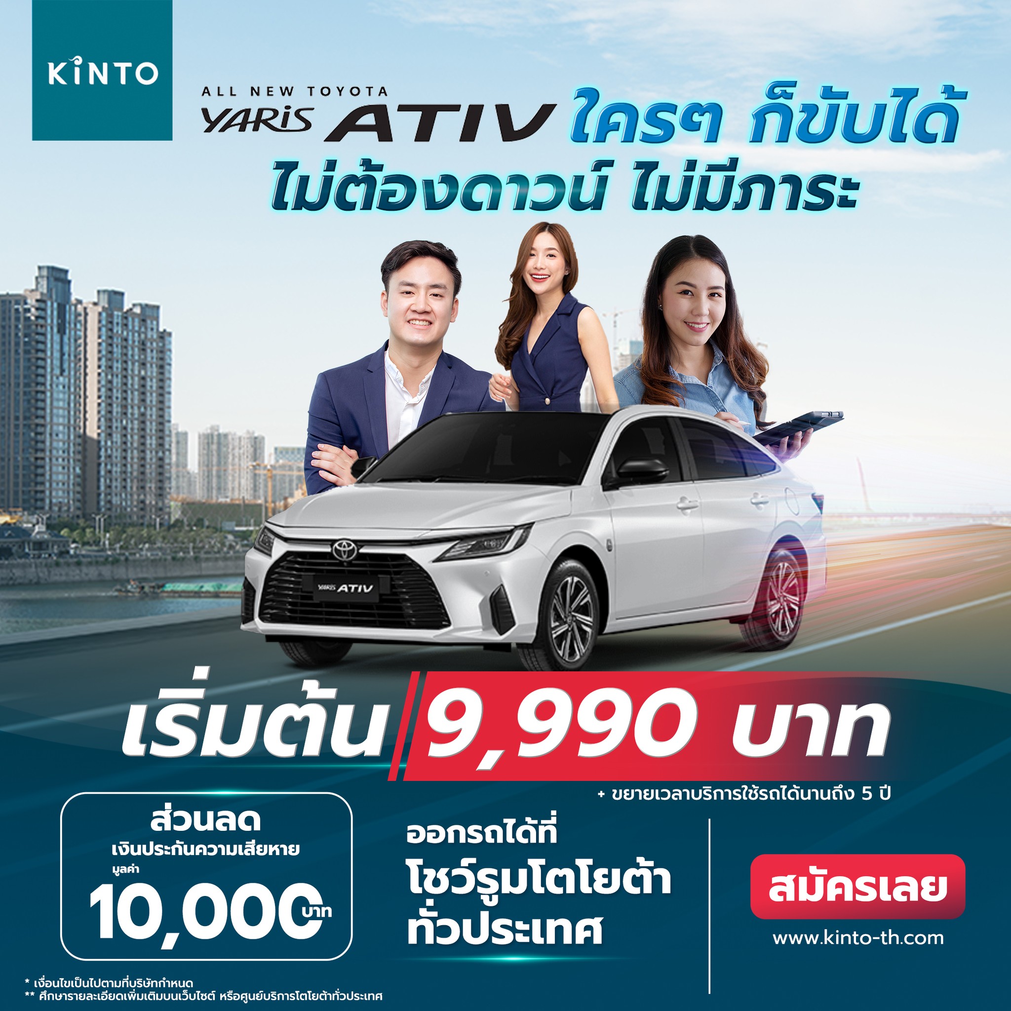 ถอยรถใหม่ แบบไม่ต้องดาวน์ ไม่มีภาระ อนุมัติไว เอกสารไม่ยุ่งยาก พร้อมดูแลแบบ Full Service กับ KINTO เพื่อให้คุณได้ขับขี่ All New Toyota Yaris ATIV อย่างสบายใจ ทางเลือกใหม่ของคนอยากมีรถ