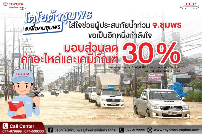 โตโยต้าชุมพร ใส่ใจช่วยผู้ประสบภัยน้ำท่วม จ.ชุมพร ขอมอบส่วนลดค่าอะไหล่และเคมีภัณฑ์ 30%