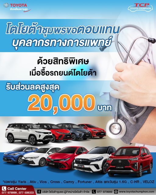 โตโยต้าชุมพร ขอตอบแทน บุคลากรทางการแพทย์👩⚕️ ด้วยสิทธิพิเศษ เมื่อซื้อรถยนต์โตโยต้า 🚗