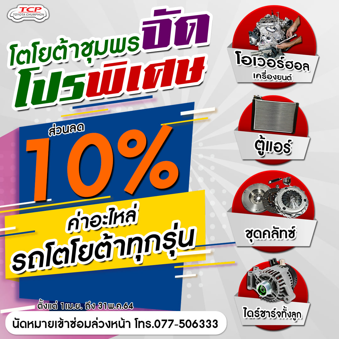 🔊🔊 โตโยต้าชุมพร จัดโปรพิเศษ💢💢 📌📌ศูนย์บริการ โตโยต้าชุมพรทุกสาขา จัดโปรพิเศษ ส่วนลดค่าอะไหล่10% สำหรับรถโตโยต้าทุกรุ่น
