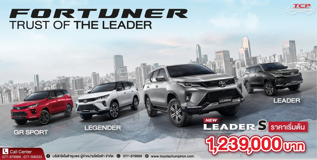 สัมผัส และเปิดประสบการณ์ความเหนือระดับสำหรับผู้นำรุ่นใหม่กับ FORTUNER LEADER S ได้แล้ววันนี้ ที่โชว์รูมโตโยต้าชุมพรทุกสาขา