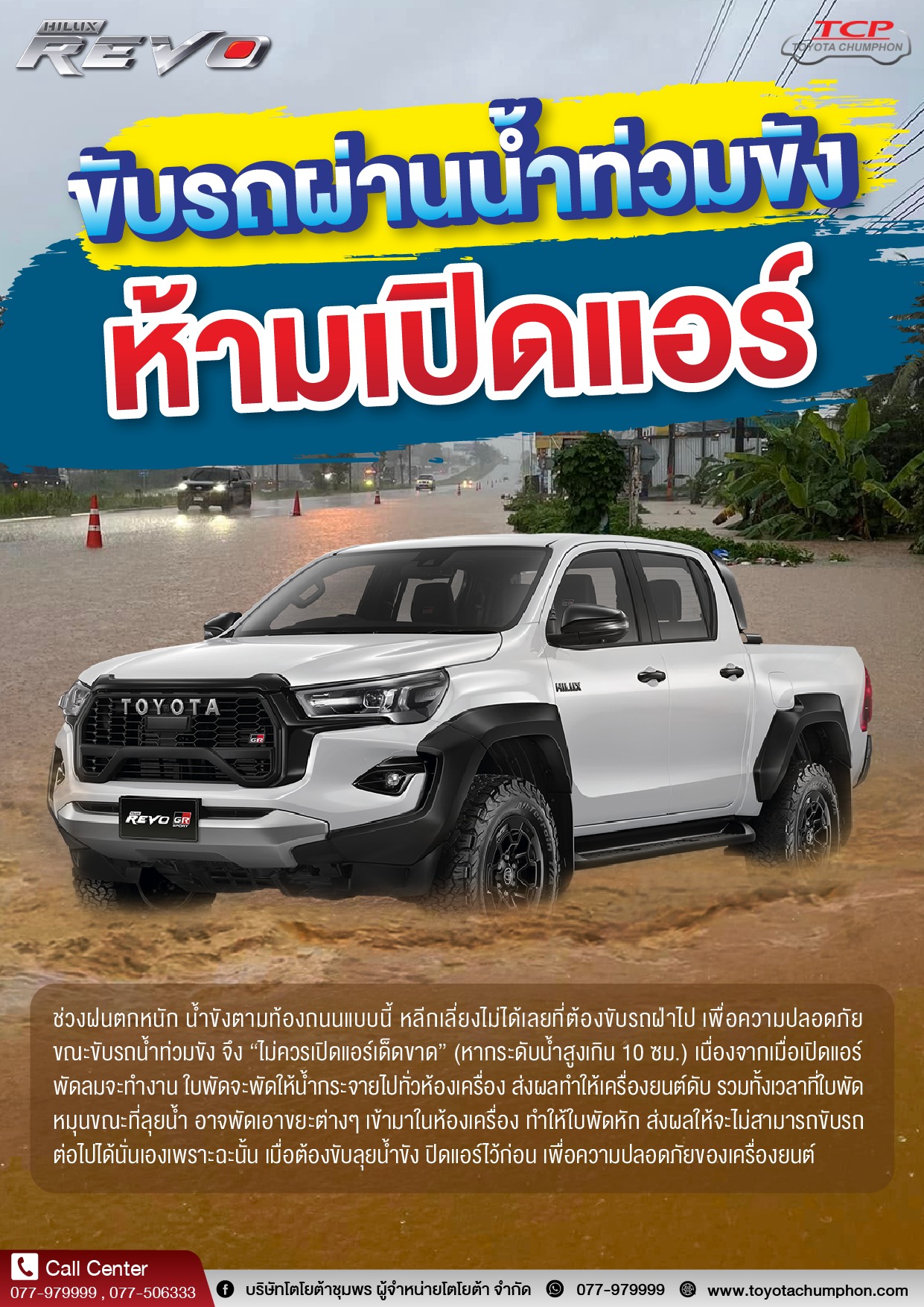 ช่วงฝนตกหนัก น้ำขังตามท้องถนนแบบนี้ หลีกเลี่ยงไม่ได้เลยที่ต้องขับรถฝ่าไป เพื่อความปลอดภัยขณะขับรถน้ำท่วมขัง จึง “ไม่ควรเปิดแอร์เด็ดขาด” (หากระดับน้ำสูงเกิน 10 ซม.) เนื่องจากเมื่อเปิดแอร์ พัดลมจะทำงาน ใบพัดจะพัดให้น้ำกระจายไปทั่วห้องเครื่อง ส่งผลทำให้เครื่องยนต์ดับ รวมทั้งเวลาที่ใบพัดหมุนขณะที่ลุยน้ำ อาจพัดเอาขยะต่างๆ เข้ามาในห้องเครื่อง ทำให้ใบพัดหัก ส่งผลให้จะไม่สามารถขับรถต่อไปได้นั่นเองเพราะฉะนั้น เมื่อต้องขับลุยน้ำขัง ปิดแอร์ไว้ก่อน เพื่อความปลอดภัยของเครื่องยนต์
