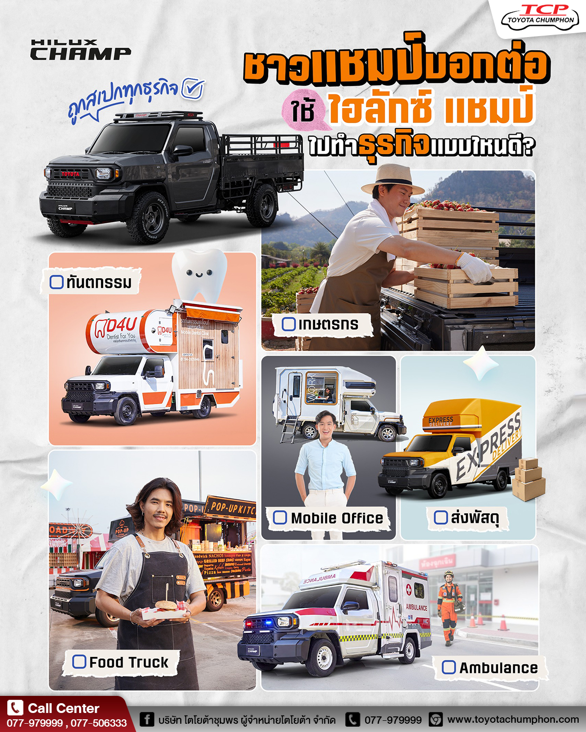 ได้แล้วที่ “แนะนำการดัดแปลงตามธุรกิจของท่าน” บนเว็บไซต์โตโยต้า คลิก! https://www.toyota.co.th/conversion/hilux_champ/advisor