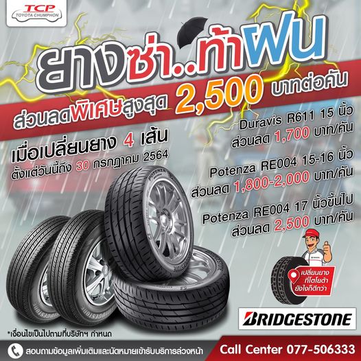 🚙 โปรโมชั่นพิเศษรับสายฝน “ยางซ่า..ท้าฝน” 🌧 เปลี่ยนยางกับเราวันนี้รับทันทีส่วนลดสูงถึง 2,500 บาท⚡️ เมื่อเปลี่ยนยาง BRIDGESTONE 4 เส้น
