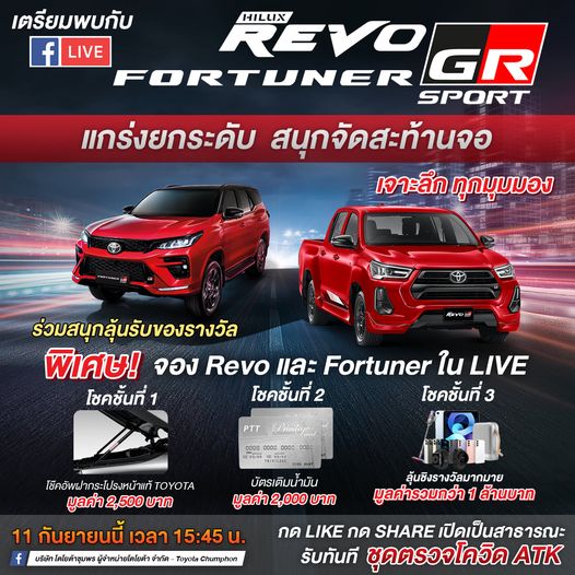 รวมพลชาว GR! กับ Live event “แกร่งยกระดับ สนุกจัดสะท้านจอ” Hilux Revo GR Sport & Fortuner GR Sport ในวันเสาร์ที่ 11 กันยายน 2564 เวลา 15.45 น.